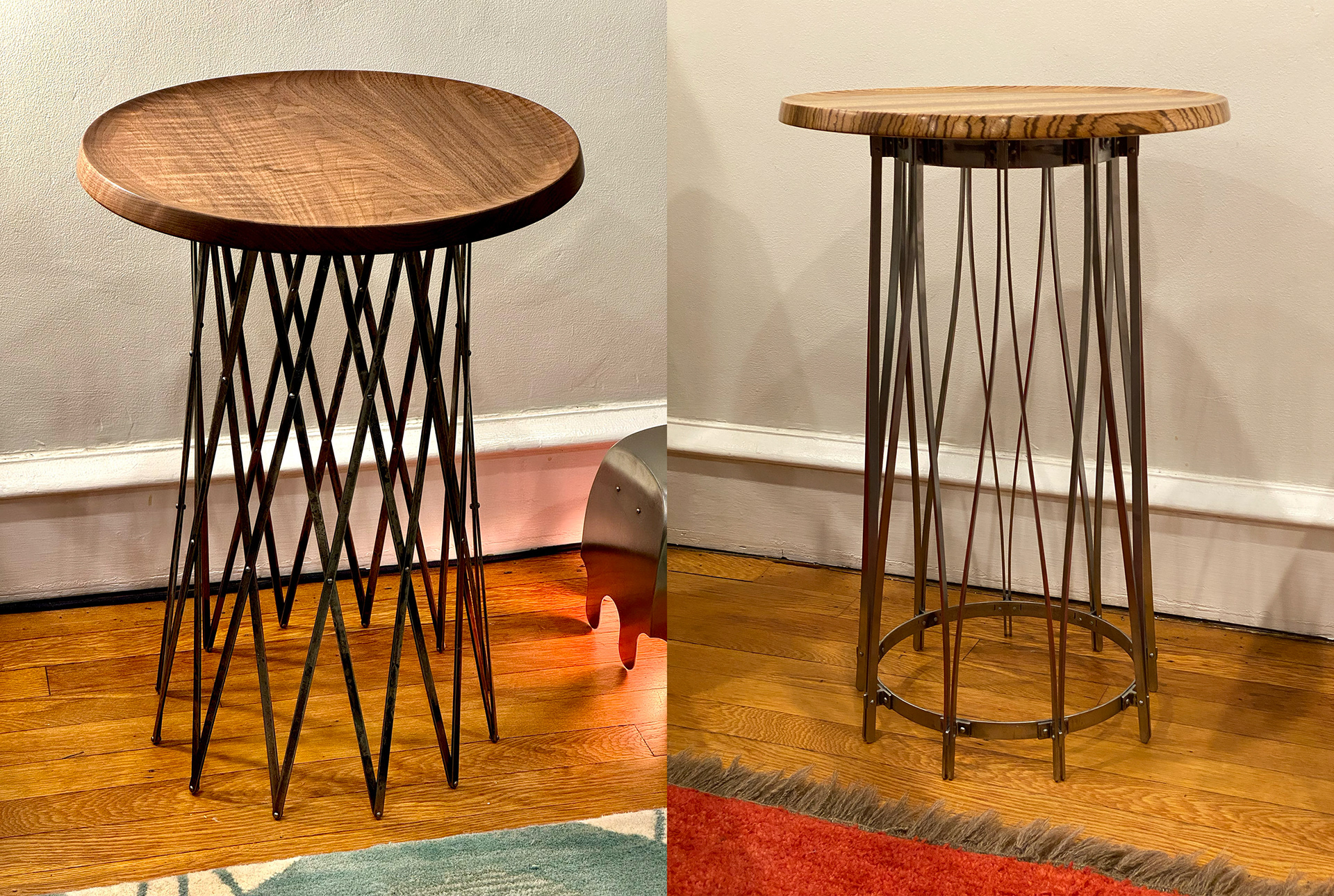 Prototype side tables exploring the use of riveted steel for the base and lathe turned tops made from quilted walnut and zebra wood.
