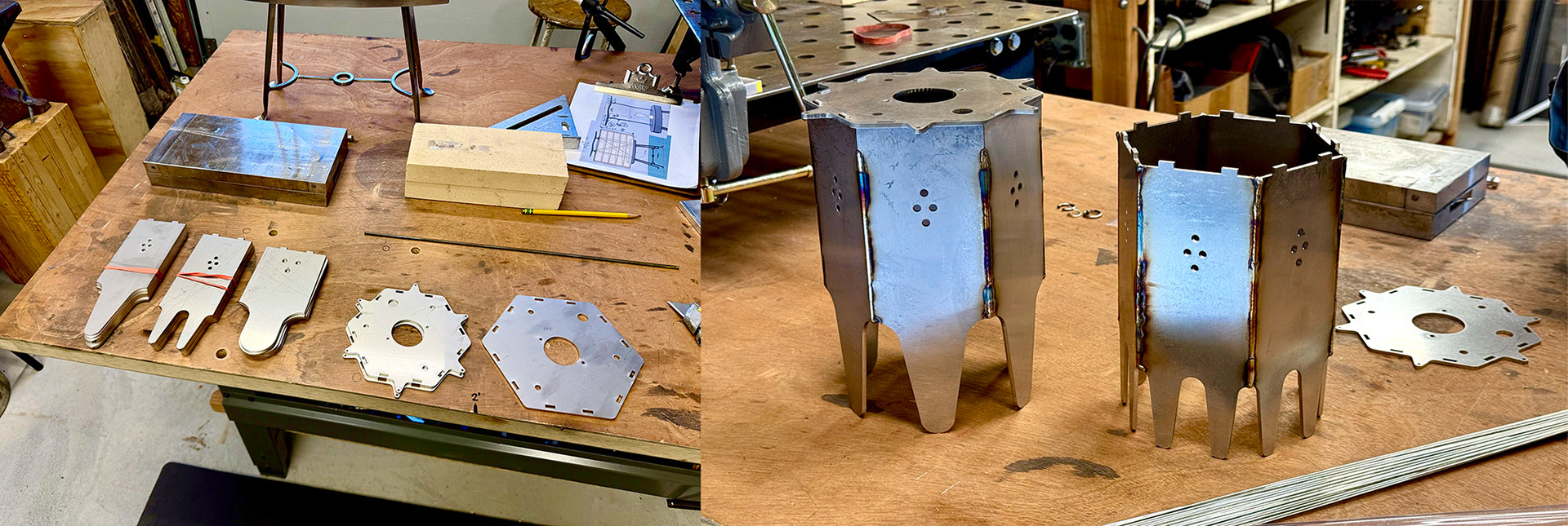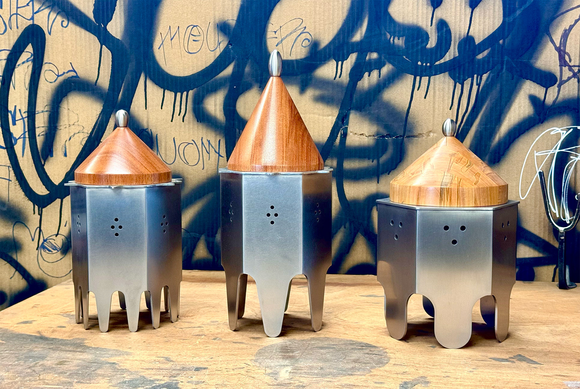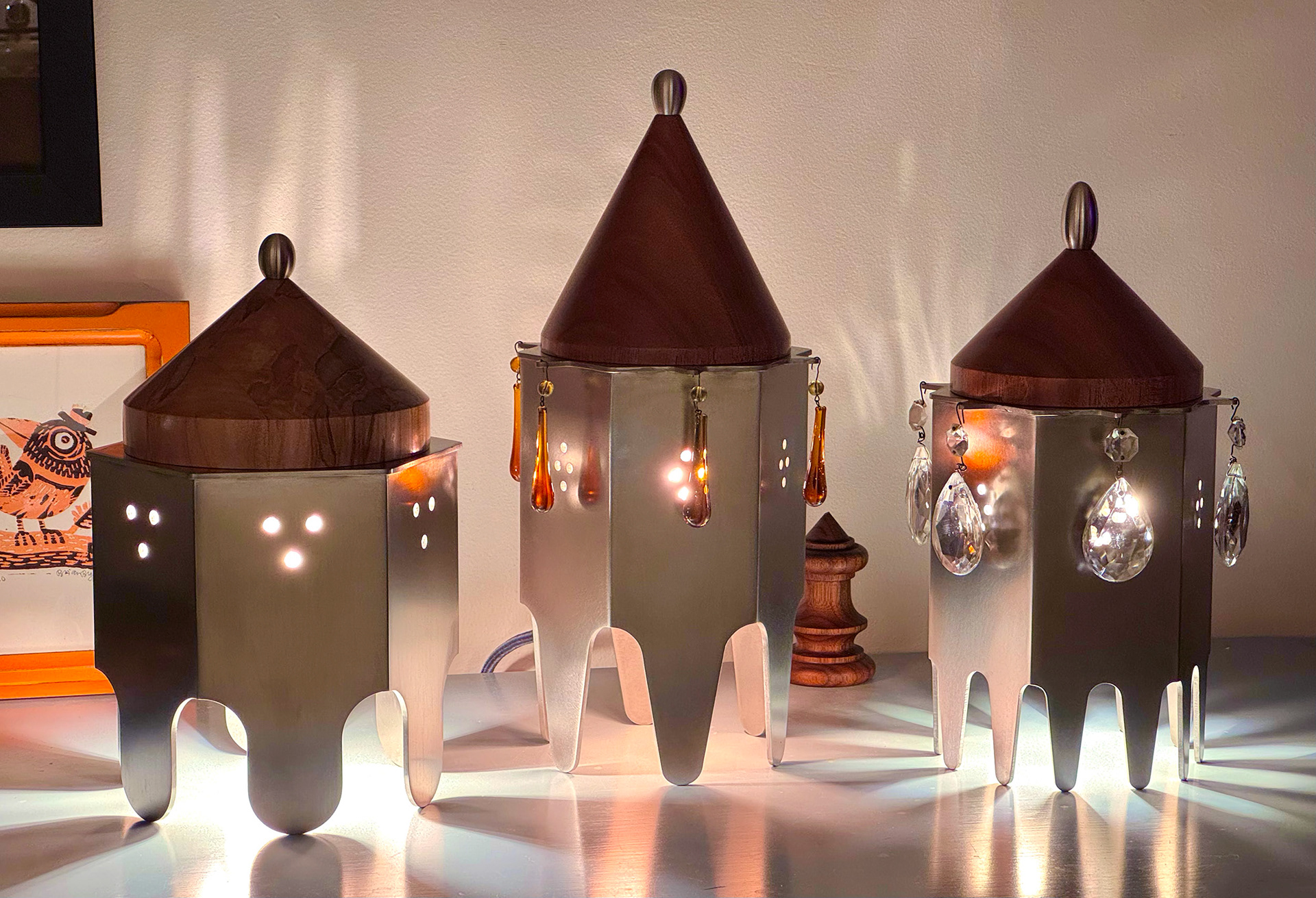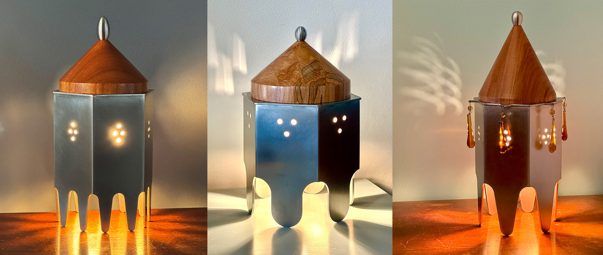 A trio of prototype accent lamps inspired by NYC water towers, Chicago bridge houses, and a hint of Arabic festival lanterns. These are fabricated from stainless steel plate, Spanish cedar, wormy maple, and glass beads.