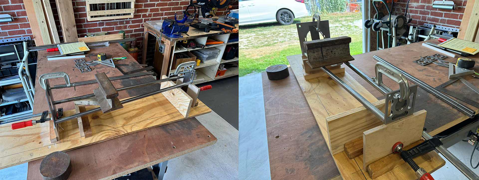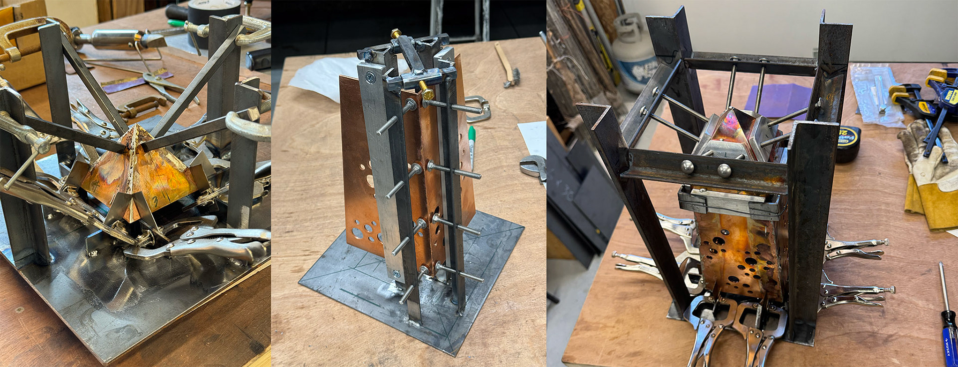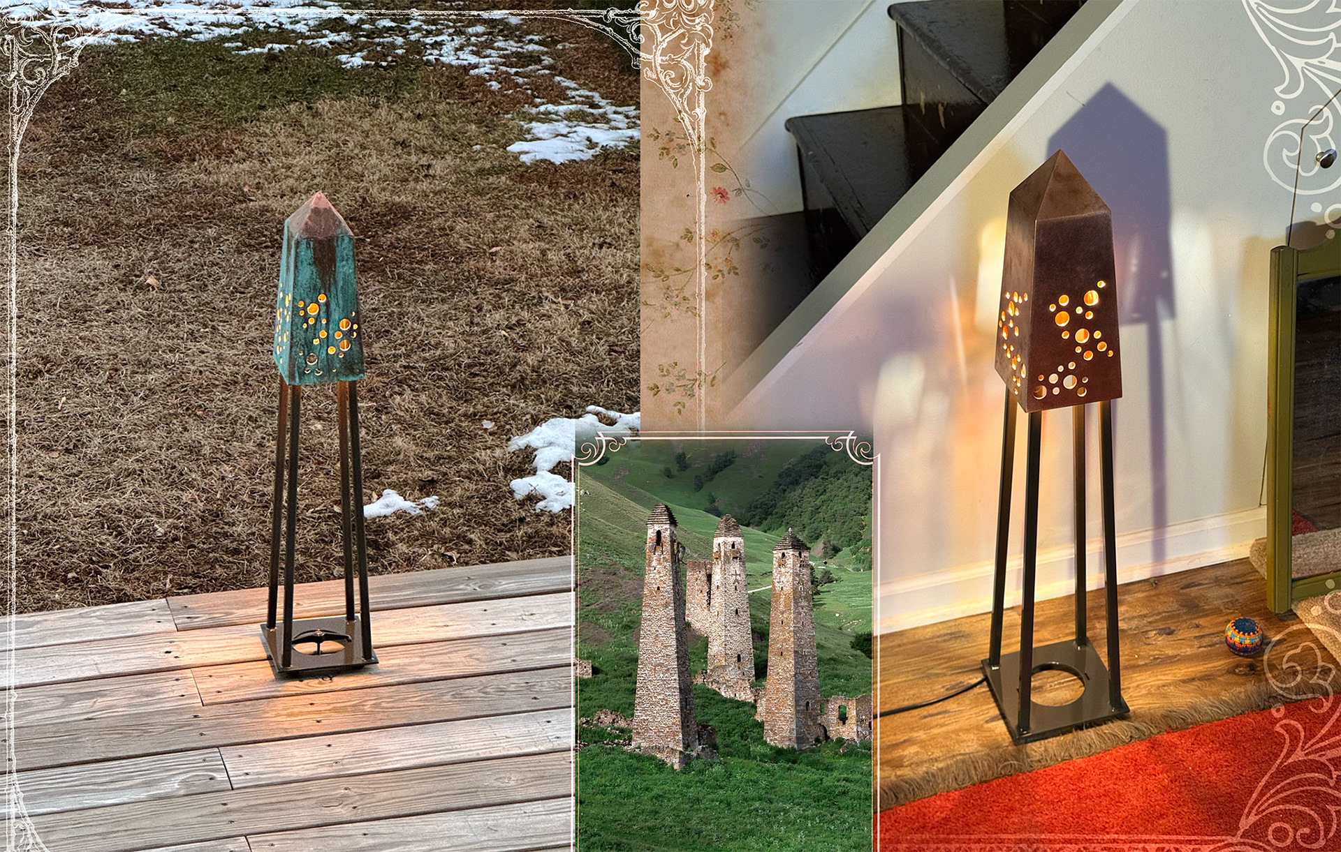 Outdoor light towers inspired by medieval "Vepshi" structures. Fabricated from mitered/soldered copper plate and powder-coated steel.